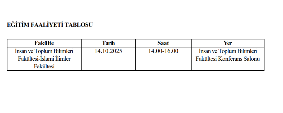 Hazırlanan bu plan dahilinde fakültemizde yapılacak etkinliğin gün, saat ve yer bilgisi Tablodaki gibidir: